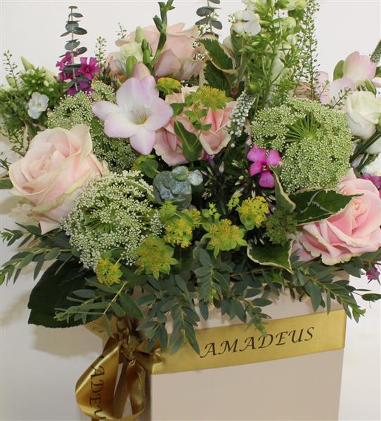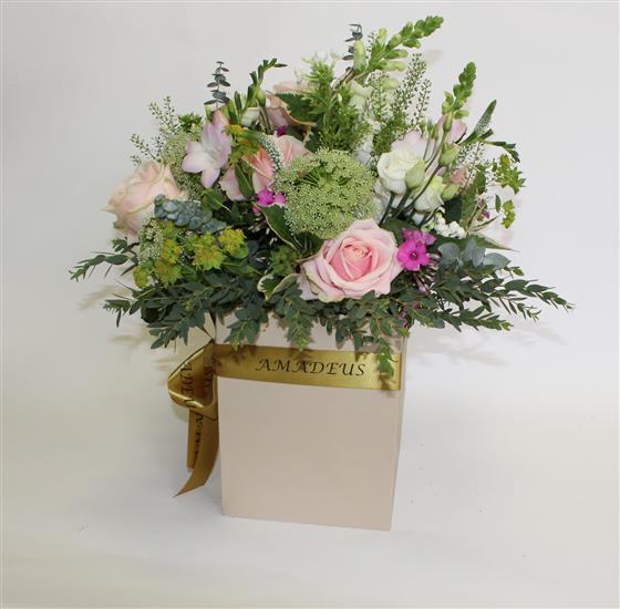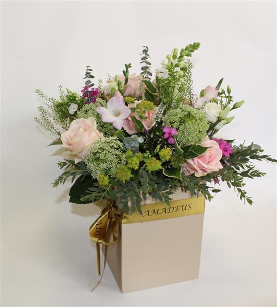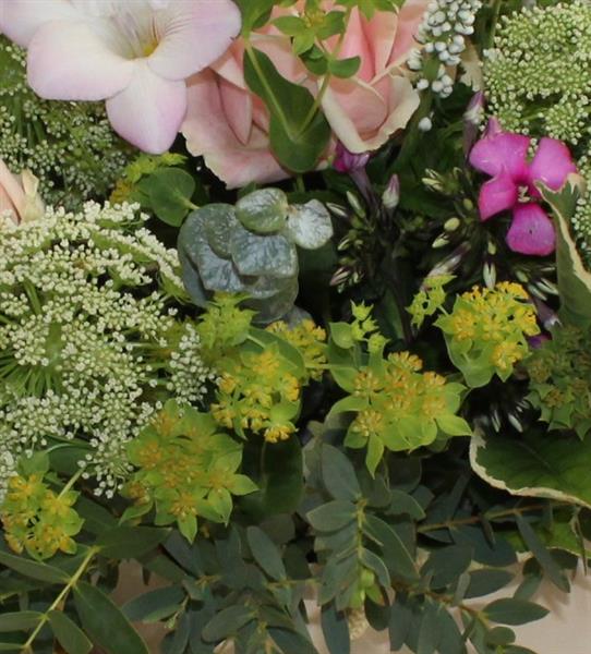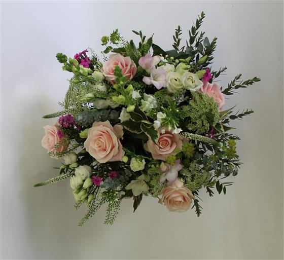 This bouquet features soft pink roses, scented freesias in a delightful wild arrangement. Perfect for any occasion.