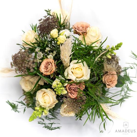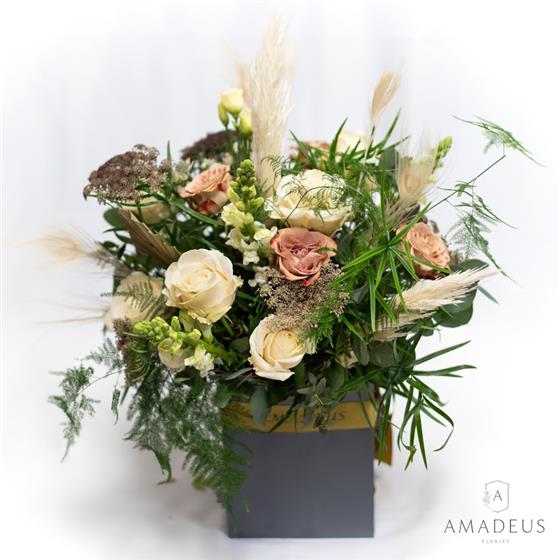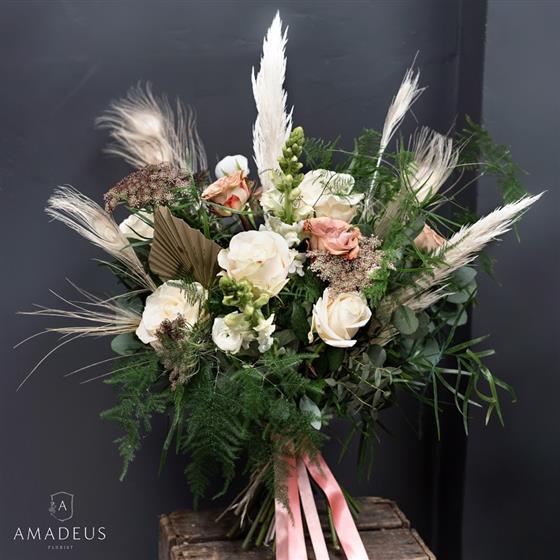 One of our favourites this season, playing a lot of with textures and shapes, this elegant designs combines premium roses, dried flowers and cream peacock feathers. It is finished off with asparagus fern and eucalyptus. Sure to make an impression.