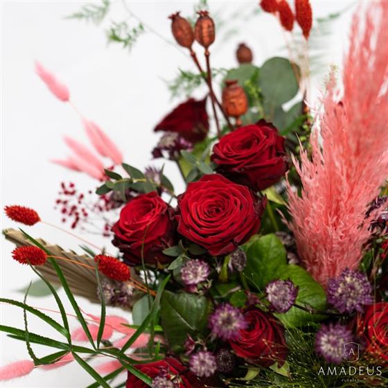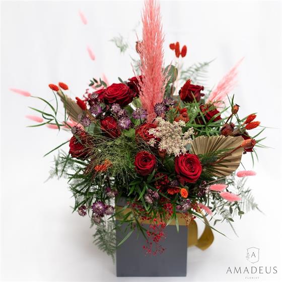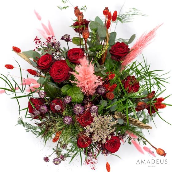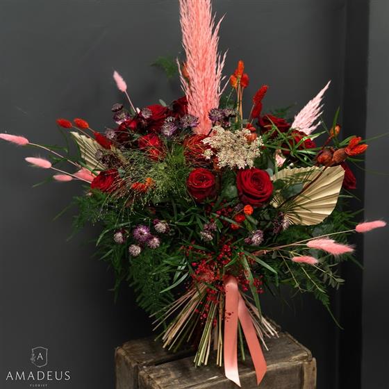 Romantic and trendy is the style. Better Together - show your love with this number. Available with dried flowers and roses in 6, 12 or 18.