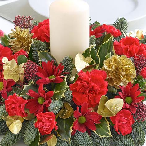 This sumptuous arrangement of flowers and foliage is a fitting decoration for the Christmas dinner table and is sure to be admired by all. We’ve chosen festive red flowers and a selection of seasonal foliage and added a chunky cream candle as the centre piece.