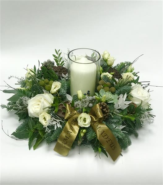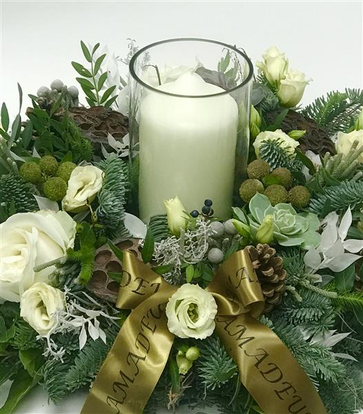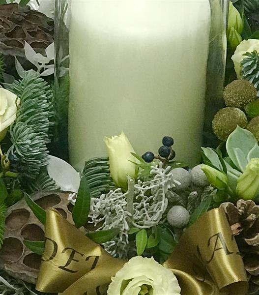 A Fresh and elegant Table wreath reminding us of fresh and frosty winter mornings. This design comes with a pillar Candle, Vase not included but available for purchase. Size in this design is 14". A Large size is 16". Design is finished off with a plain gold or silver ribbon (No shop ribbon)