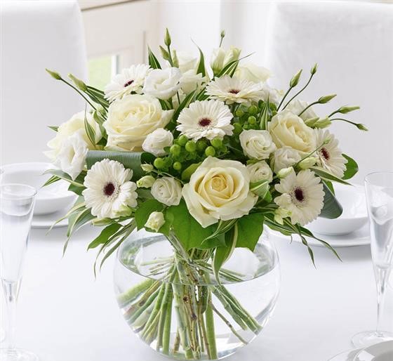 Purest white flowers interspersed with lush greenery create an effortlessly chic display. This stylish centrepiece exudes natural beauty, with a sense of balance and symmetry that is ultra-fashionable.