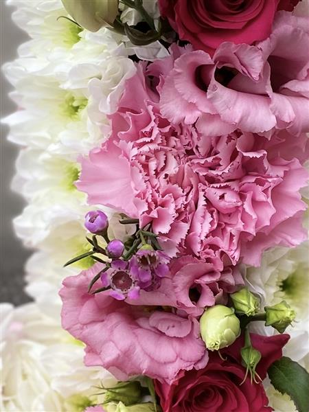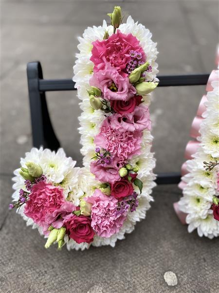 This is different and unique way of wording or lettering. It is a combination of basing and mixed flowers. Basing is done in white chrysanthemums in this design. Basing can be in any colour of choice. So are the mixed flowers too.