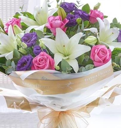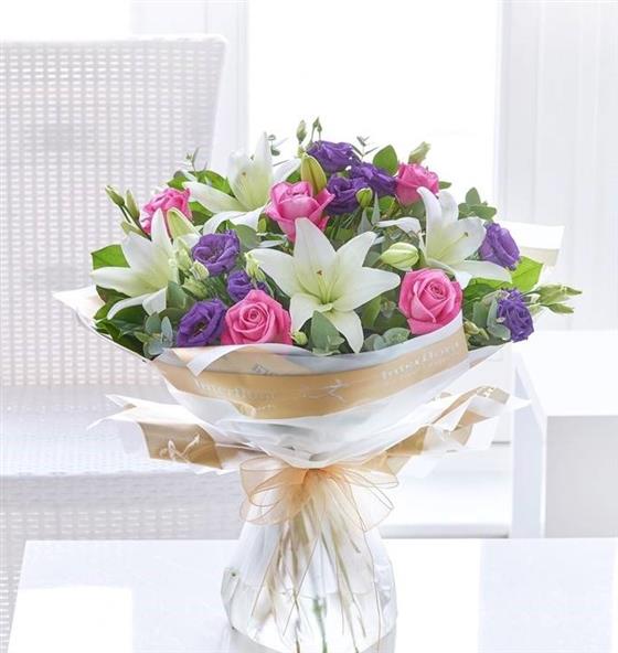A Delightful combination of oriental lilies, velvet pink roses and purple lisianthus sitting on a bed of scented eucalyptus.