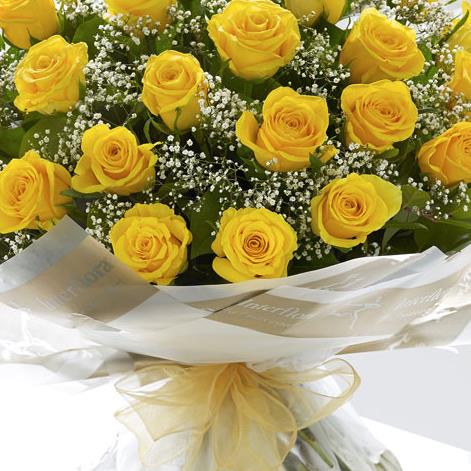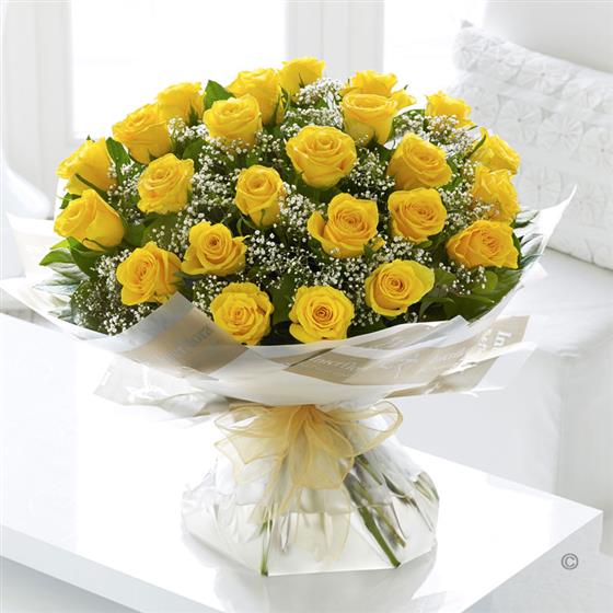 Featuring 24 large-headed yellow roses hand-tied with gypsophila and salal leaves, and finished with gift wrap and ribbon.