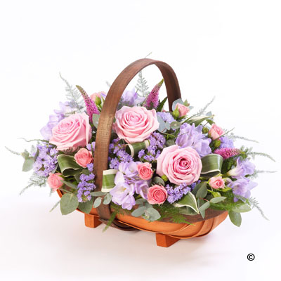 A traditional trug basket filled with roses, veronica, statice and scented freesias in pinks and lilacs.