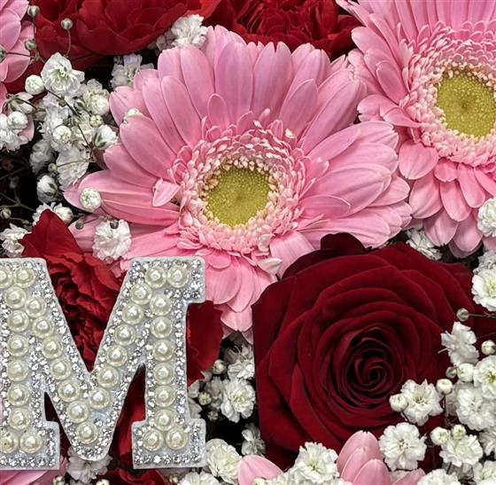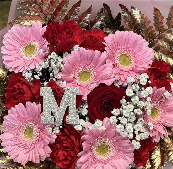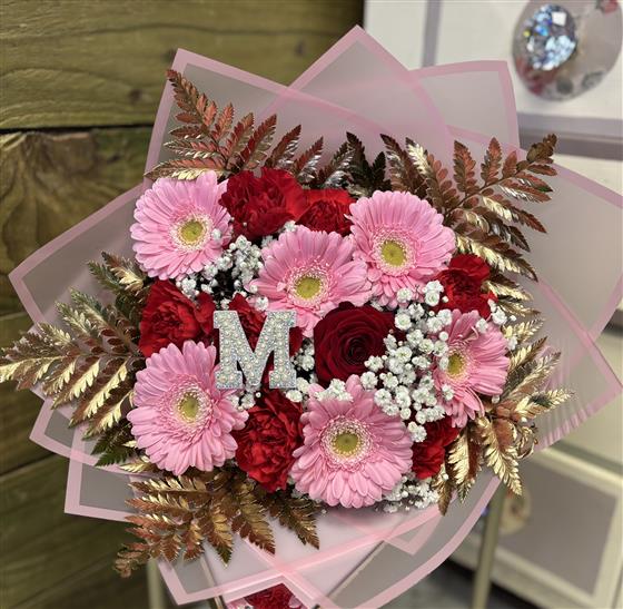 This bouquet contracts red and pink flowers for a unique bouquet. Initial included for personalisation.