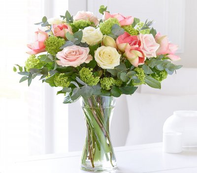 This hand-tied bouquet has a timeless quality that will appeal to all ages. Warm pink tones, a mix of soft velvety petals and lots of delicate detail all come together beautifully to create a harmonious style statement. Glamorous roses and amaryllis add a sense of luxuriousness too. Vase not included but available at checkout. Picture shows supreme size