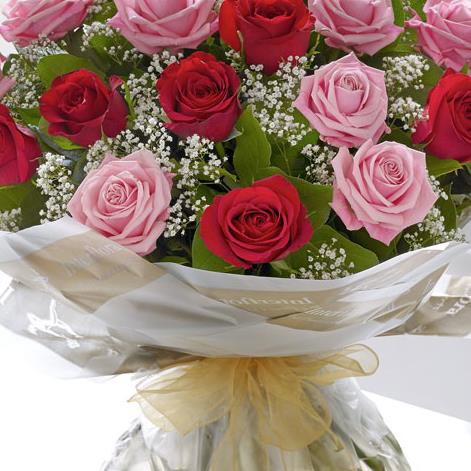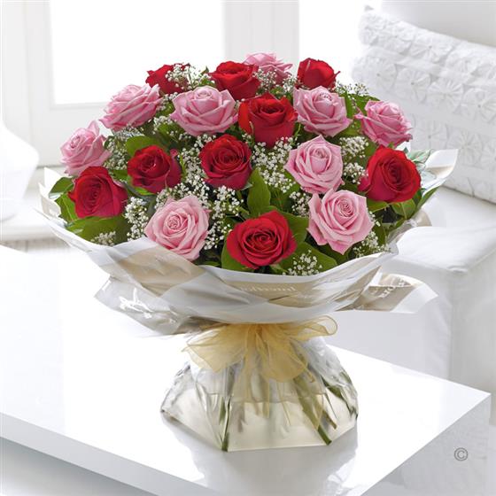 Featuring a mixture of 12, 18 or 24 large-headed red and pink roses hand-tied with gypsophila and salal leaves, and finished with gift wrap and ribbon.