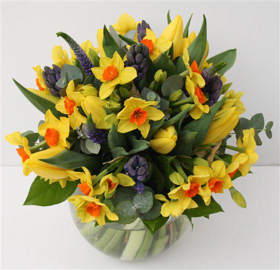 A delightful mix of blue hyacinths, blue veronica and narcissus on a bed of salal and eucalyptus. Spring is definitely here. Vase not included.