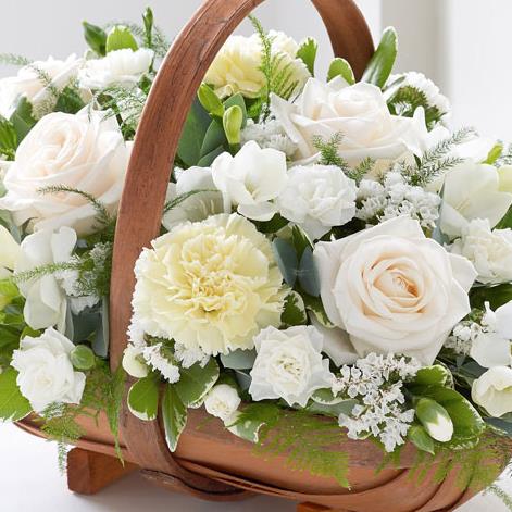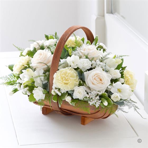 A traditional two-tone trug basket filled with roses, carnations, spray carnations, statice and scented freesias in fresh white with green foliage.