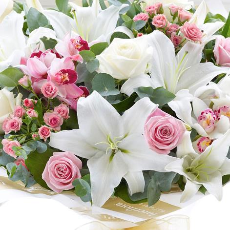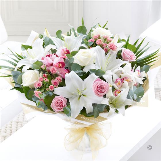 Featuring 1 pink and 1 white mini cymbidium orchid, 2 white Oriental lilies, 3 large-headed ivory roses, 3 large-headed pink roses, 3 large-headed ivory roses and 2 pink spray roses with palm leaves, eucalyptus and salal, hand-tied, wrapped and finished with gold voile ribbon.