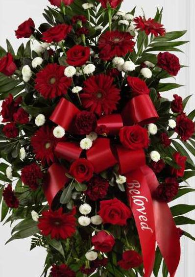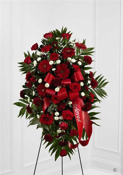 This beautiful standing spray is a rich and colourful way to express your love and devotion. A stunning arrangement in shades of red includes roses, carnations, spray carnations and gerbera with white spray chrysanthemums and lush greens. Accented by red satin ribbon and standing on a wire easel, this standing spray will make a truly beautiful addition to the service.