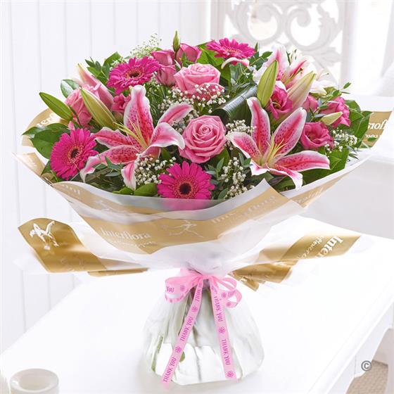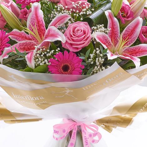 Featuring pink Oriental lily, pink large-headed roses, cerise germinis and pink lisianthus, hand-tied with gypsophila, aspidistra leaves, eucalyptus and salal .Trimmed with a Thank you ribbon and presented in Interflora Gift Packaging.