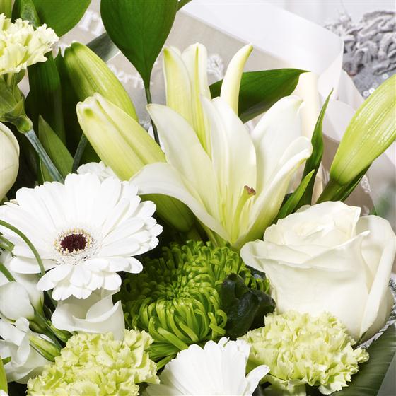 Featuring ivory large headed roses, cream LA lilies, white lisianthus, white germini, green carnations and green chrysanthemums carefully arranged with trailing asparagus fern, aspidistra and ruscus and finished with gift wrap and ribbon.