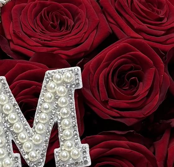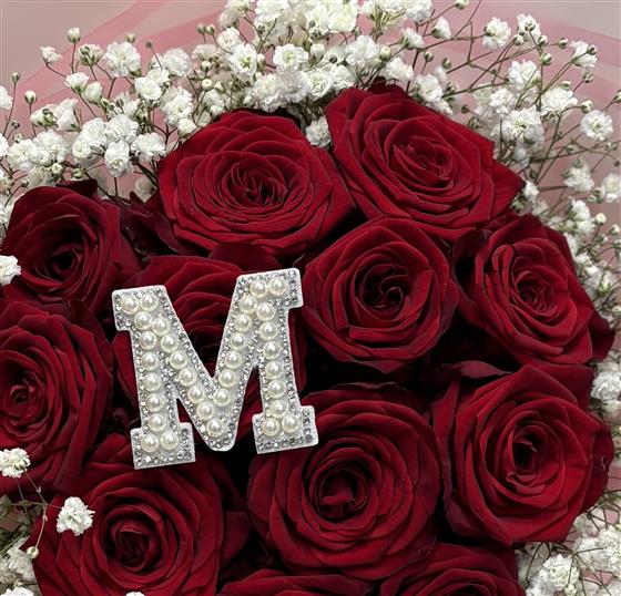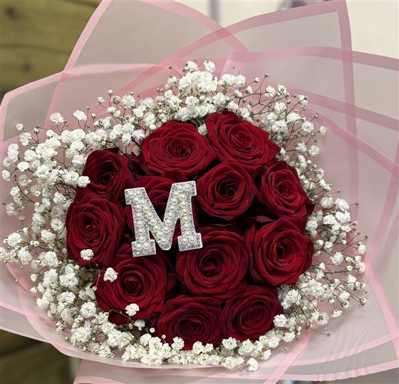 New to our Princess collection is this lovely premium red rose bouquet edged with gyp and presented in a luxurious wrap. Recipient's Initial included for personalisation. 12 Roses for Standard, 18 Roses for Deluxe and 24 roses for Supreme