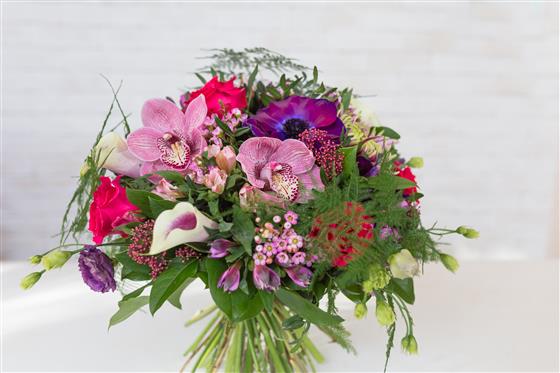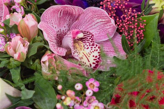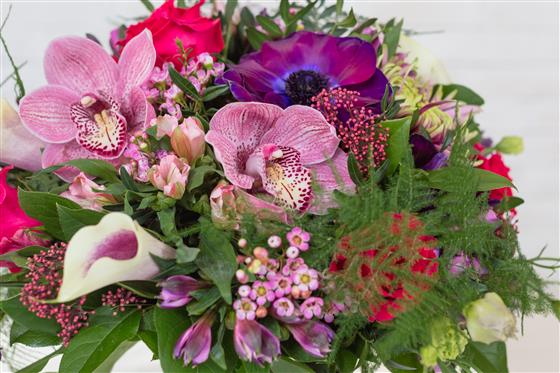 A special arrangement of cerise roses, pink orchids on a bed of soft and delicate fillers.