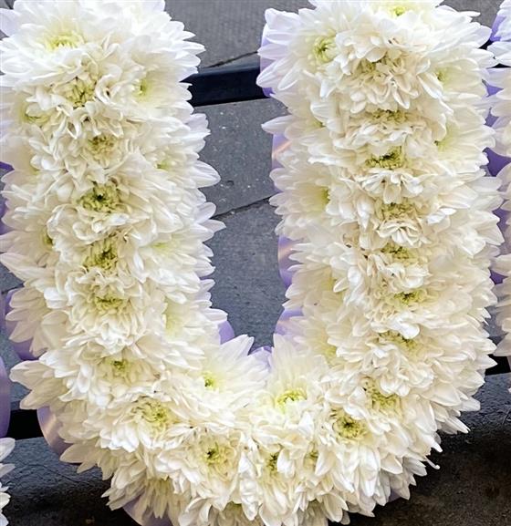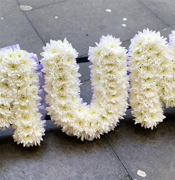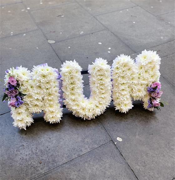 A beautiful MUM Tribute with lilac ribbon, white basing and lilac spray/mount flowers