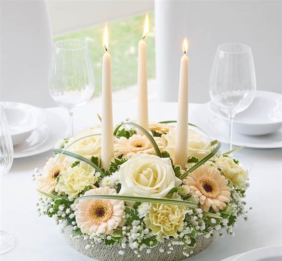 This design has a timeless elegance that will suit any occasion. A chic selection of flowers are expertly arranged to create a stunning centrepiece. Sleek candles will add a soft glow to complement these warm peach and cream tones.
