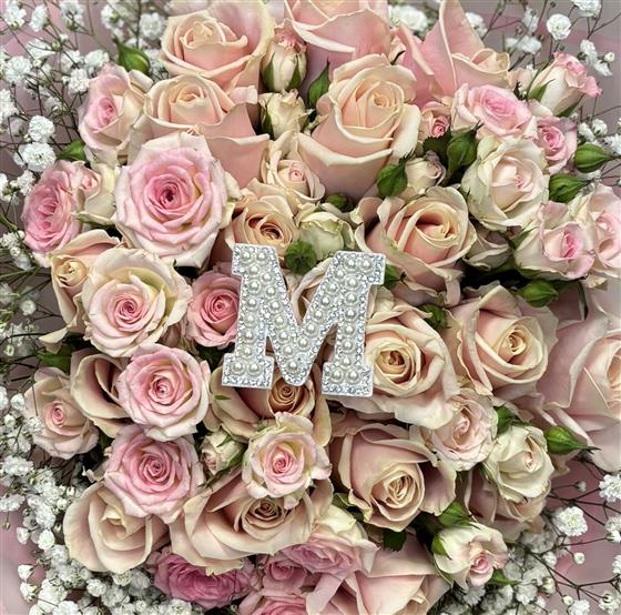 New to our princess collection is this bouquet of pink rose and spray roses finished with gyp in a luxurious wrap