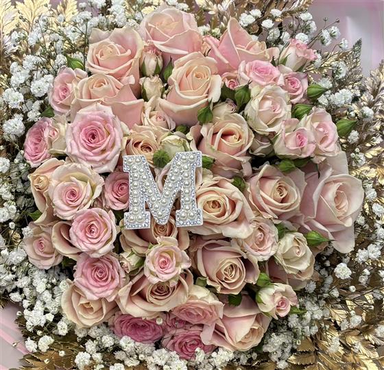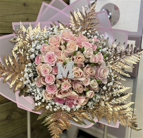Also Part of our Princess collection is this bouquet of soft pink roses and spray roses finished off with gyp and gold leather leaf. This is made with 18 roses. Deluxe is 24 roses and Supreme is 30 roses