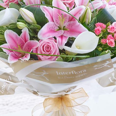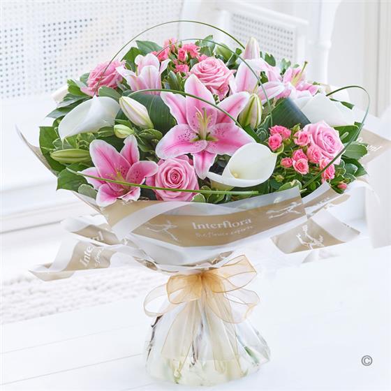 To create this sensational hand-tied bouquet, we’ve opted for a mix of premium quality roses and lilies in pretty shades of warmest pink and creamy white. It’s a perfect choice if you really want to spoil her with a glamourous gift. She’s sure to be impressed!