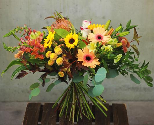 Rich colours, shapes and textures combine beautifully in this bouquet. The design brings together a wonderful selection of bright coloured flowers including orange asiatic lilies, velvety soft pompoms and distinctive Gerberas. A glorious gift choice.