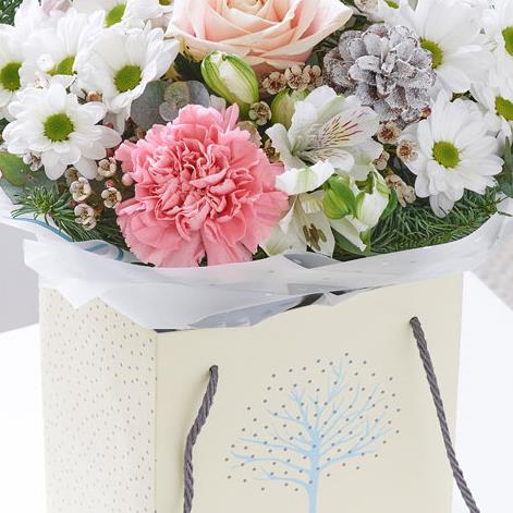 Featuring 3 pink carnations, a pale pink large headed rose, 2 white spray chrysanthemums, a white wax flower with silver glitter and 2 white alstroemeria with spruce, holly, salal tips, eucalyptus and a frosted silver pine cone, presented in a winter gift bag.