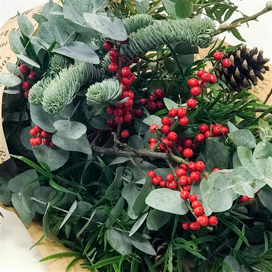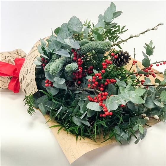 For Foliage lovers, this is a mix of Eucalyptus and Christmas foliage. Perfect as fresh or dried. This design is very versatile. It can be handtied to use as a door swag or can be split into small vases to go around the house.