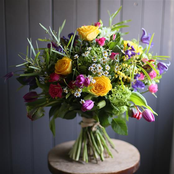 Featuring yellow large headed roses, purple tulips, and a mix of fresh spring flowers, all expertly hand-tied with eucalyptus, salal tips, finished with spring gift wrap and ribbon, presented in our shop's gift packaging.